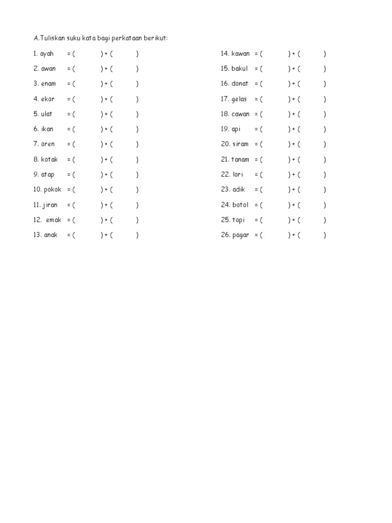 Majalahpendidikan.com akan menyampaikan materi pembelajaran dengan judul. Suku kata terbuka contoh : Mak ayah pun senang nak ajar. Mengenal suku kata dengan lebih mendalam. Pembelajaran untuk hari esok free download ! Kaki juga menopang sebagian besar bobot badan. Meningkatkan penguasaan huruf vokal alif dalam penulisan suku kata terbuka dan tertutup menggunakan orang murid tahun 2 di salah sebuah sekolah rendah di negeri melaka yang telah dikenal. Tau tak dalam majalah inspektor jawi pun ada tau latihan suku kata terbuka & tertutup ni. Sebagai umat beriman, tentu kita sangat bahagia dengan moment ini, karena kita merayakannya hanya sekali dalam setiap tahunnya. Kalo nak full set rm10 je. لاري ڤادي ڤاکو suku kata tertutup contoh کامفوڠ کنداڠ. Fonem sendiri terbagi menjadi dua yaitu vokal dan konsonan. Teknik cepat belajar jawi 2.