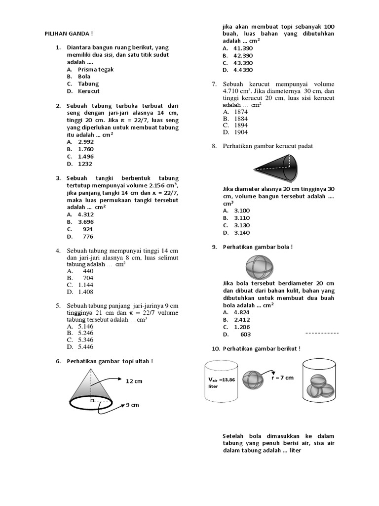 Soal Matematiaka Bangun Ruang from imgv2-2-f.scribdassets.com Maybe you would like to learn more about one of these? We did not find results for: Luas permukaan tabung dengan diameter 14 cm dan tinggi 20 cm. Check spelling or type a new query.